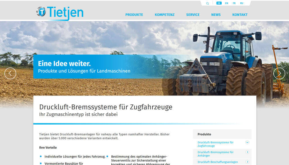 Tietjen ist ein familiengeführtes Unternehmen mit über 40 Jahren Erfahrung in der Entwicklung von Druckluft-Bremsanlagen. Mit ihren 60 Mitarbeitern haben sie sich zum Marktführer für Druckluft-Bremssysteme entwickelt. Neben ihren Systemen bieten sie 5.000 verschiedene Varianten von Nachrüstsätzen an. Seit der Gründung verkaufte Tietjen so über 75.000 Druckluft-Bremsanlagen. Dabei umfasst das Produktsortiment Druckluft-Bremssysteme für Zugfahrzeuge und Anhänger, Bausätze und Ersatzteile und Nachrüstungen für Anhängerkupplungen. Diese Produkte lassen sich in drei Produktbereiche und Kernkompetenzen unterteilen. Dazu gehört der Bereich der Off-Highway OE, der sich mit Druckluft-Bremssystemen für unter anderem Traktoren, Ernte- und Baumaschinen beschäftigt, der Bereich der Trailer OE für Zentral-, Deichsel- und Sattelanhänger, und der Bereich des Aftermarkets für Bausätze und Ersatzteile.